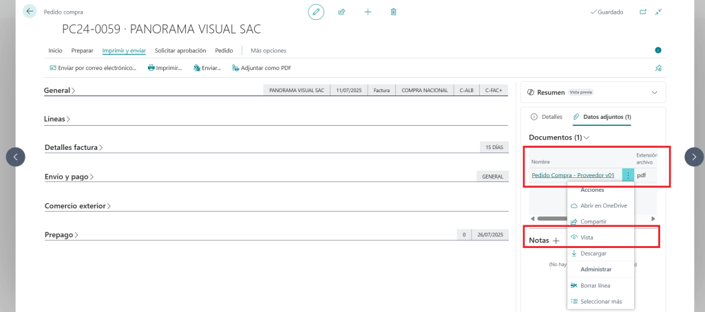 No requiere configuración adicional. Si el archivo adjunto es un PDF, Business Central lo detecta y muestra el botón de vista previa automáticamente. Además, puedes seguir descargándolo si lo necesitas.