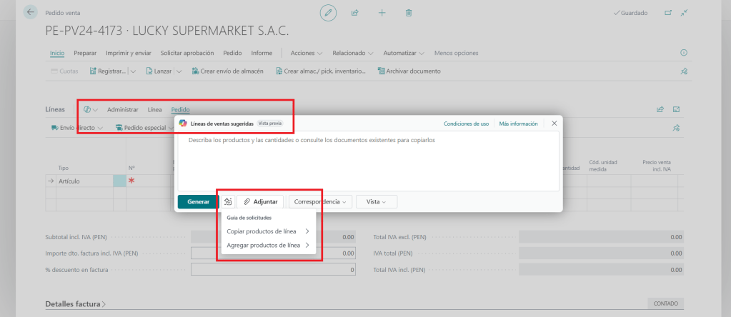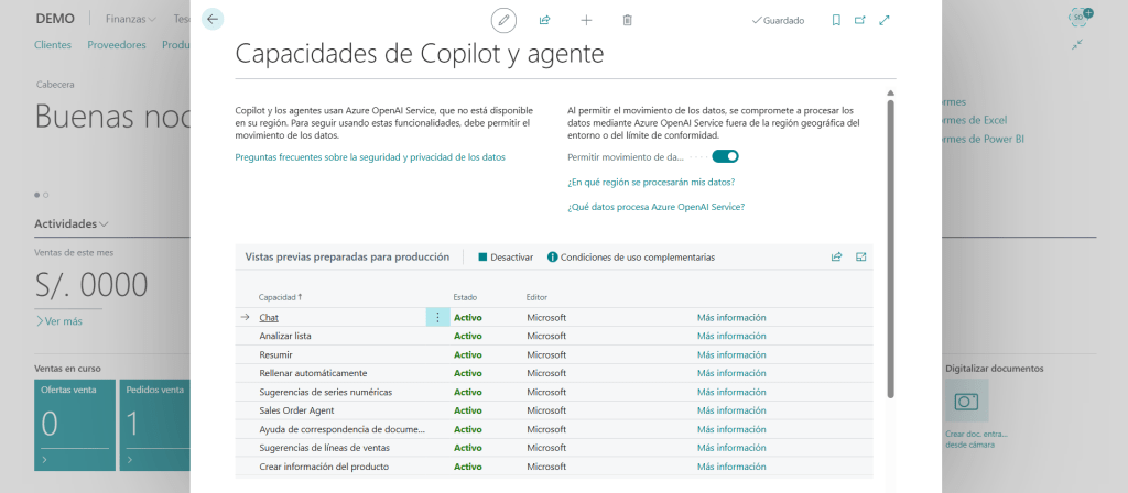 Ahora Copilot no solo sugiere textos: rellena campos automáticamente en procesos clave como órdenes de compra, diarios de sostenibilidad y análisis financiero. habilitando esta opción conseguirás datos sugeridos: